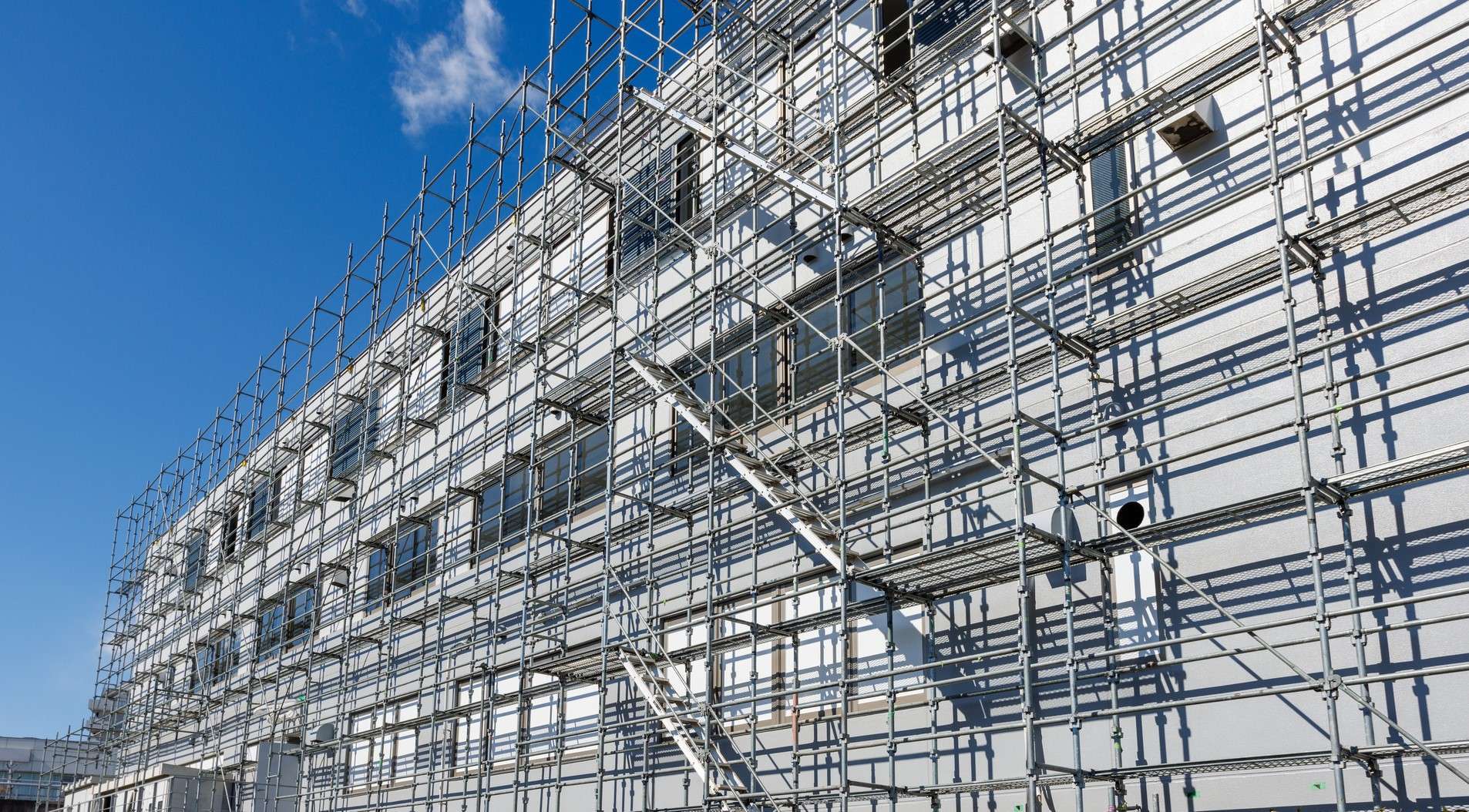 足場と躯体の間に隙間が生じる最も一般的な理由は、構造的な制約と安全確保のための設計上の必要性です。たとえば、枠組足場では建地(縦支柱)や手すり、巾木(床端の立ち上がり)を取り付けるために一定の距離を確保する必要があり、壁面に密着させることが難しくなります。また、外壁の凹凸やサッシ、配管設備などの障害物によって足場を建物に近づけられない場合もあります。さらに、ベースジャッキの高さ調整や地盤の傾斜、仮設機材のサイズの違いによっても微妙なズレが生じます。これらの要因が重なることで、隙間が3cm、場合によっては10cm以上に広がることもあります。