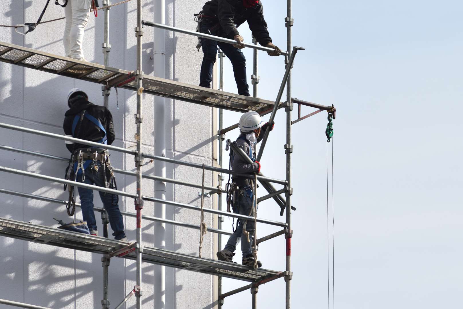 「足場屋は怖い・危険」というイメージを持つ方もいるかもしれません。しかし、現在の建設現場では安全管理が最優先事項です。ヘルメットや安全帯(命綱)の着用が厳格に義務付けられています。